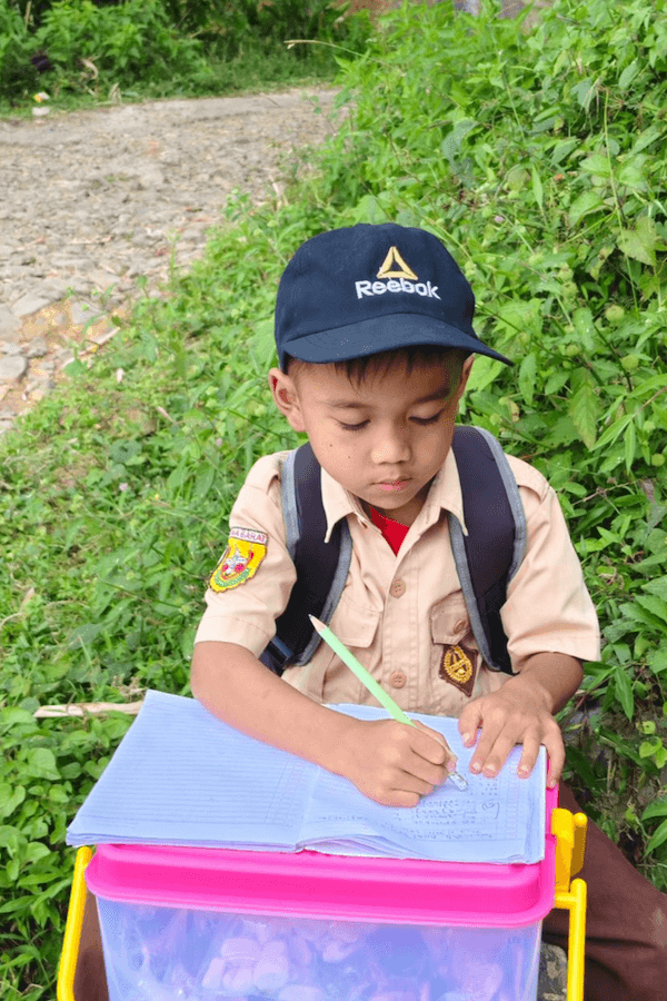 Dengan menenteng dagangan, terus melangkah, berjualan keliling demi ibunya bisa sembuh.